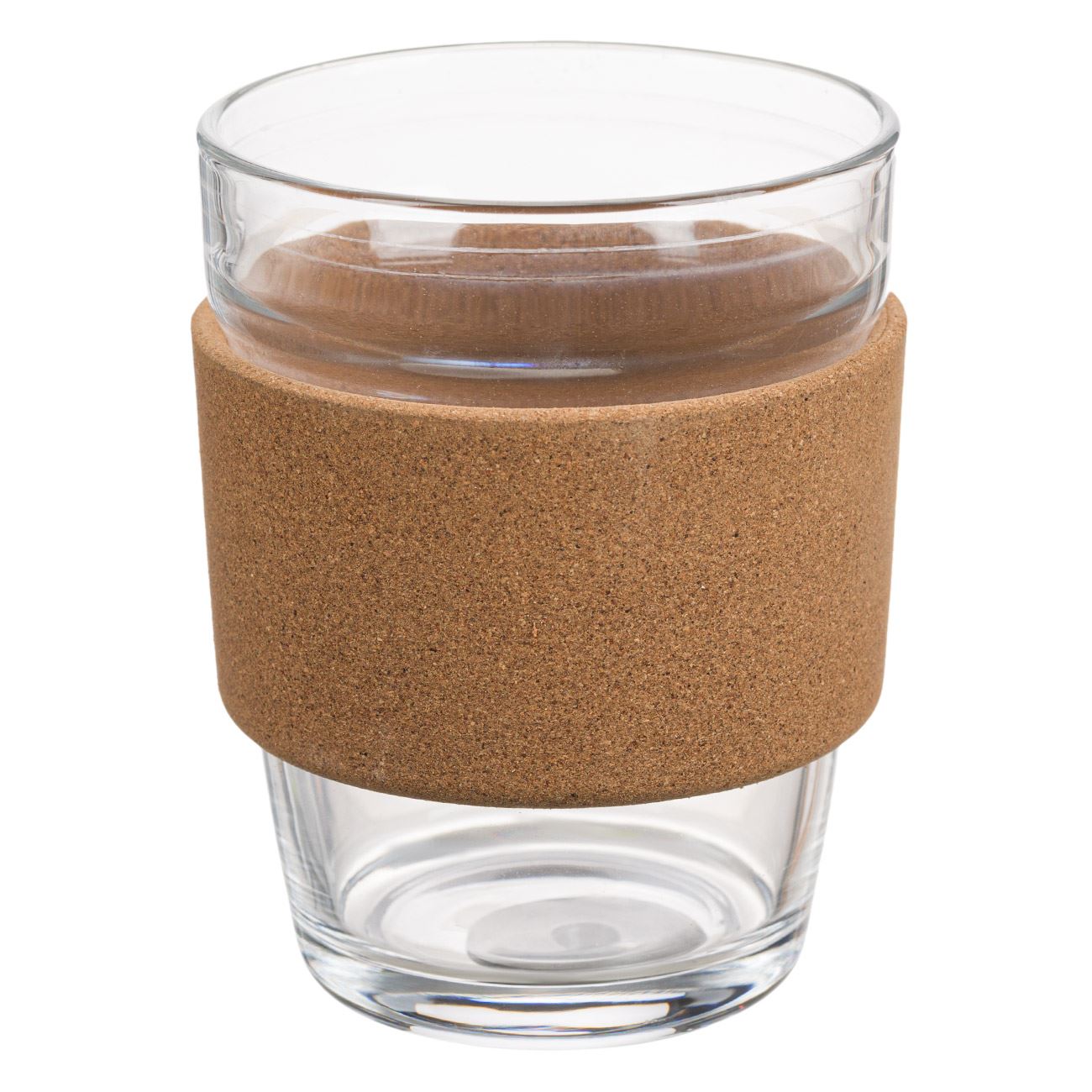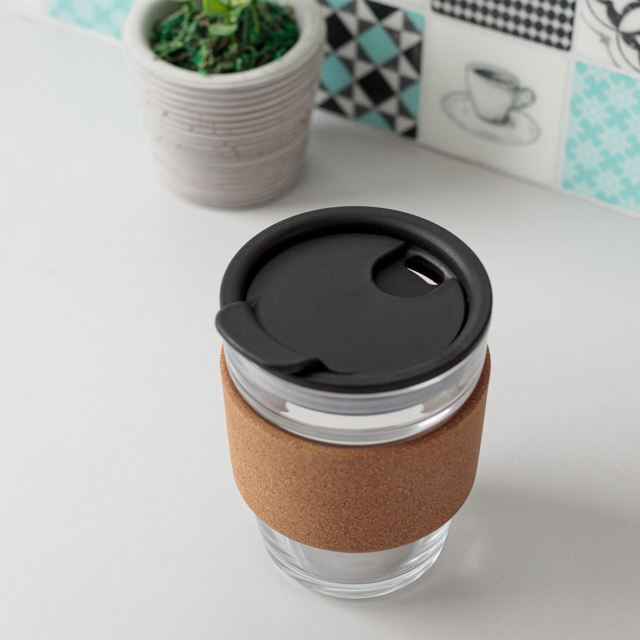 Cana cafea voiaj sticla, transparent, cu suport din pluta, capac de plastic cu inchidere, 300ml