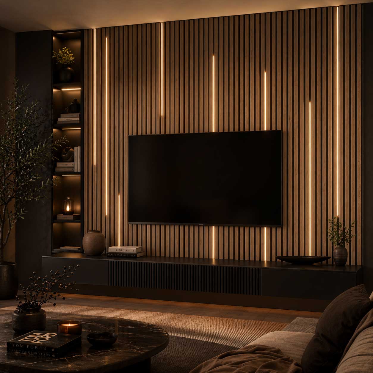 Riflaj decorativ acustic, MDF, furnir, pasla, panou riflaj lemn de perete, interior, living, hol, mahon, Riflaj Maro, 2500x305mm, 0.76 m², Callena