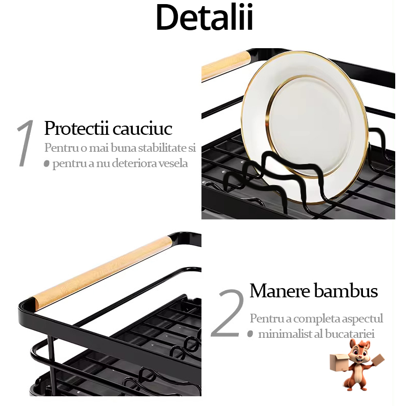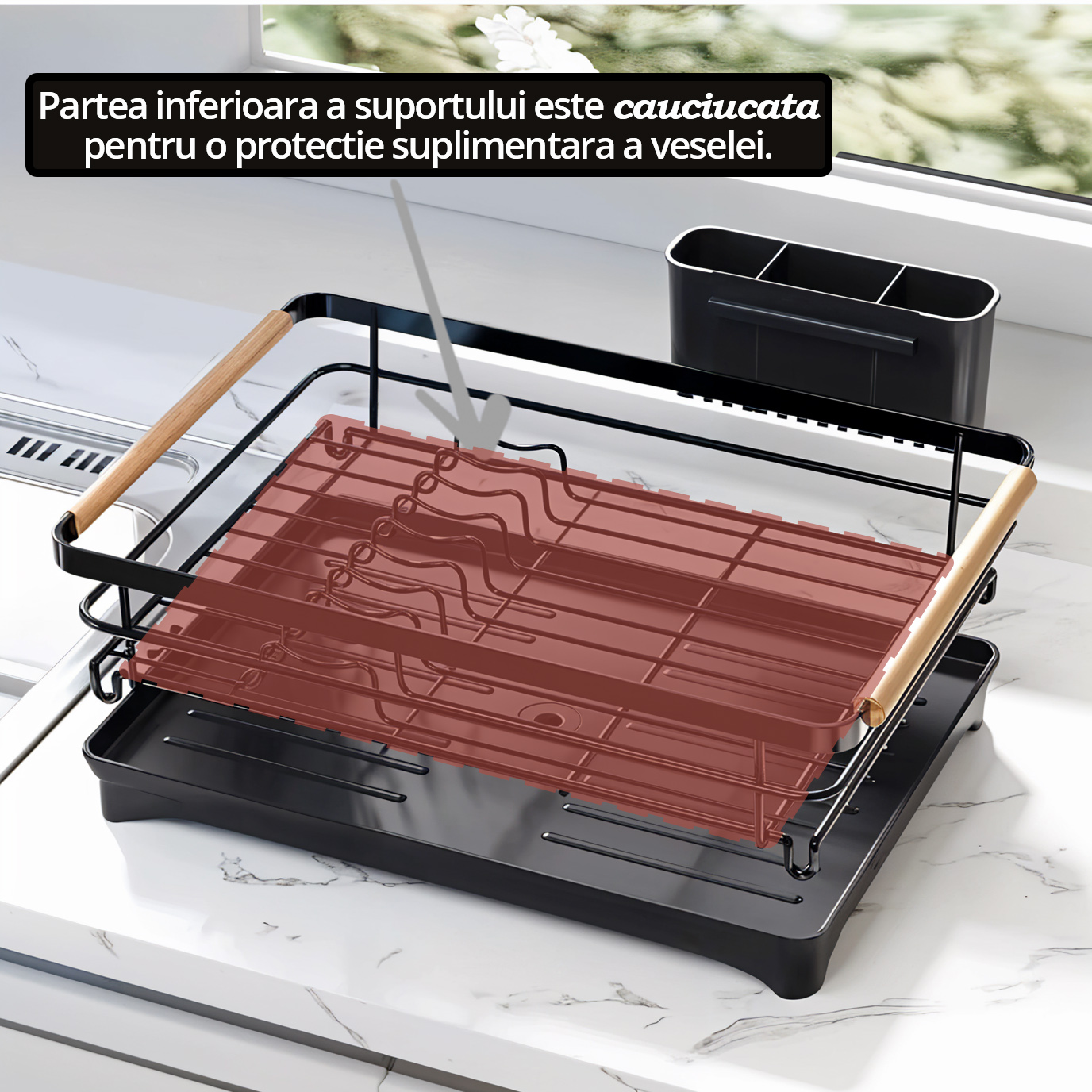 Scurgator vase chiuveta, uscator vase cu protectii cauciuc, manere bambus, cu tava si tub de scurgere, negru, vintage, 42x31x14cm, Callena