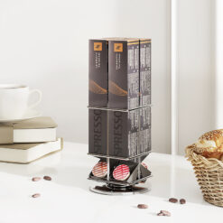 Transformă-ți colțul de cafea într-un spațiu ordonat și elegant. Suportul Callena pentru 4 cutii de capsule este conceput special pentru Nespresso Original Line, oferind un mod practic de a depozita cutiile preferate chiar lângă espressor. Designul rotativ îți permite să alegi rapid sortimentul dorit, iar finisajul argintiu din oțel completează perfect orice bucătărie modernă sau spațiu office.
